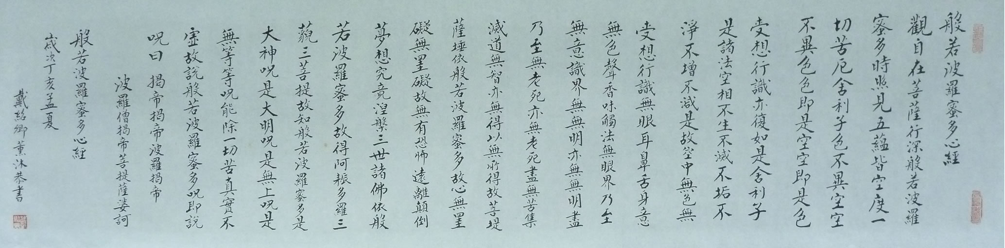 戴紹卿老師書法作品--101123/P1030551.png上一頁 | 首頁 | 下一頁 戴紹卿老師書法作品--08般若波羅密多心經 觀自在菩薩,行深般若波羅密多時,照見五蘊皆空,度一切苦厄。 舍利子! 色不異空,空不異色,色即是空,空即是色;受想行識,亦復如是。 舍利子! 是諸法空相:不生不滅,不垢不淨,不增不減。 是故空中 無色,無受想行識。 無眼耳鼻舌身意,無色聲香味觸法。 無眼界,乃至無意識界。 無無明,亦無無明盡;乃至無老死,亦無老死盡。 無苦集滅道。 無智,亦無得。 以無所得故! 菩提薩埵,依般若波羅密多故,心無罣礙,無罣礙故,無有恐怖, 遠離顛倒、夢想,究竟涅槃。 三世諸佛,依般若波羅密多故,得阿耨多羅三藐三菩提! 故知般若波羅密多, 是大神咒,是大明咒,是無上咒,是無等等咒。能除一切苦!真實不虛! 故說般若波羅密多咒, 即說咒曰:羯諦!羯諦!波羅羯諦!波羅僧羯諦!菩提娑婆訶! |
