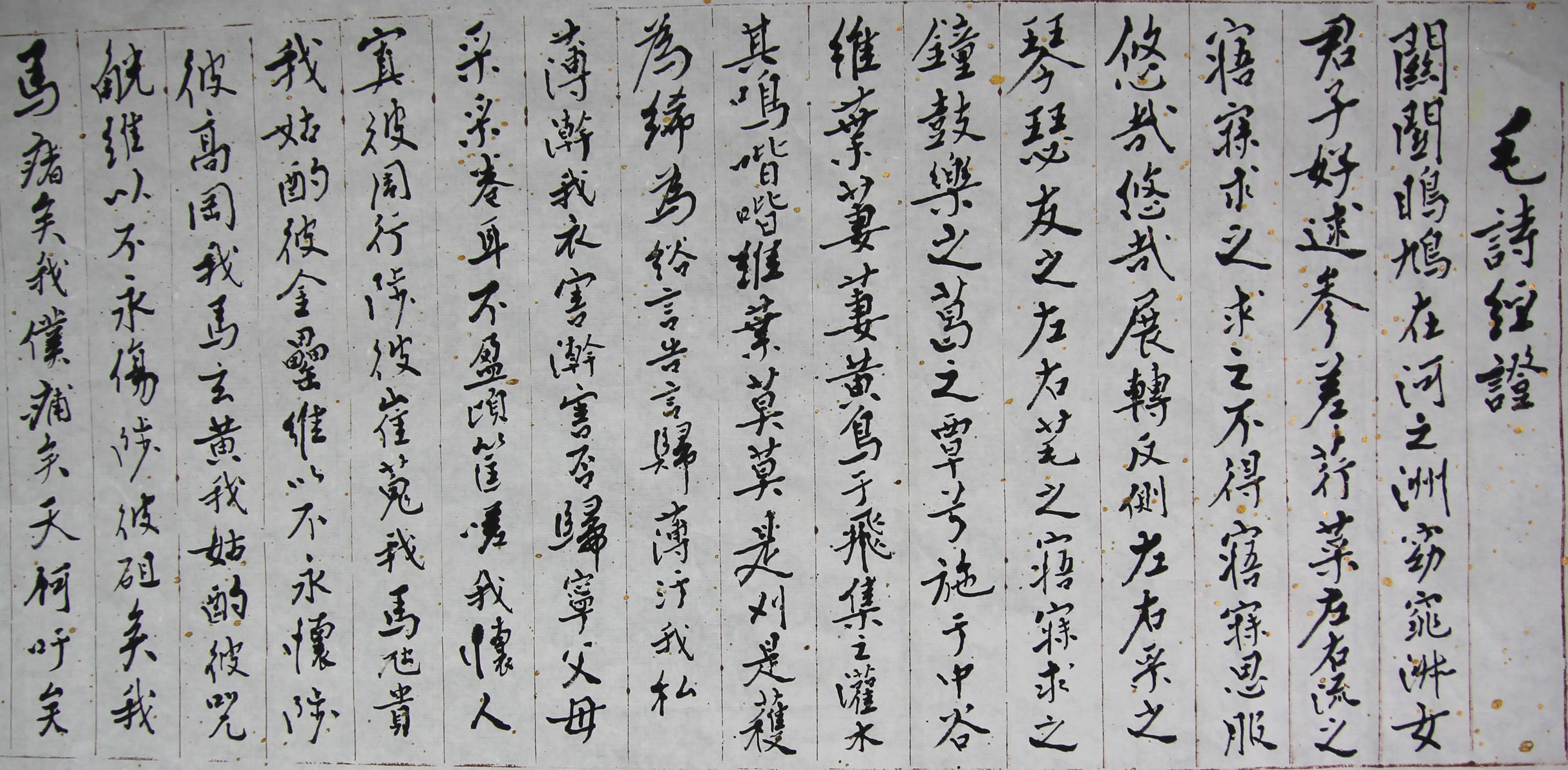 戴紹卿老師書法作品--170905/IMG_5447.png上一頁 | 首頁 | 下一頁《毛詩經證》 關雎 關關雎鳩,在河之洲。窈窕淑女,君子好逑。 參差荇菜,左右流之。窈窕淑女,寤寐求之。 求之不得,寤寐思服。悠哉悠哉!輾轉反側。 參差荇菜,左右采之。窈窕淑女,琴瑟友之。 參差荇菜,左右芼之。窈窕淑女,鍾鼓樂之。 葛覃 葛之覃兮,施于中穀,維葉萋萋。黃鳥于飛,集于灌木,其鳴喈喈。 葛之覃兮,施于中穀,維葉莫莫。是刈是穫,為絺為绤,服之無斁。 言告師氏,言告言歸。薄污我私,薄浣我衣。害浣害否?歸寧父母。 卷耳 采采卷耳,不盈頃筐。嗟我懷人,寘彼周行。 陟彼崔嵬,我馬虺隤。我姑酌彼金曐,維以不永懷。 陟彼高岡,我馬玄黃。我姑酌彼兕觥,維以不永傷。 陟彼砠矣,我馬瘏矣,我僕痡矣,云何吁矣! |