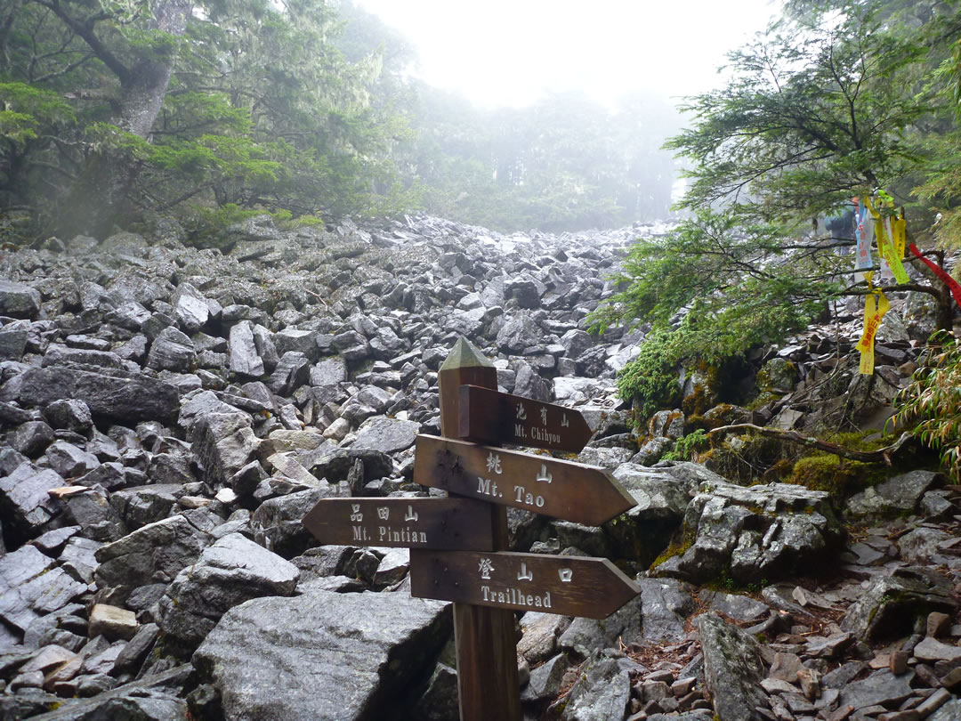 1110 碎石坡叉路,直行過碎石坡可往新達山屋,今取右沿碎石坡邊緣上行,往登池有山。