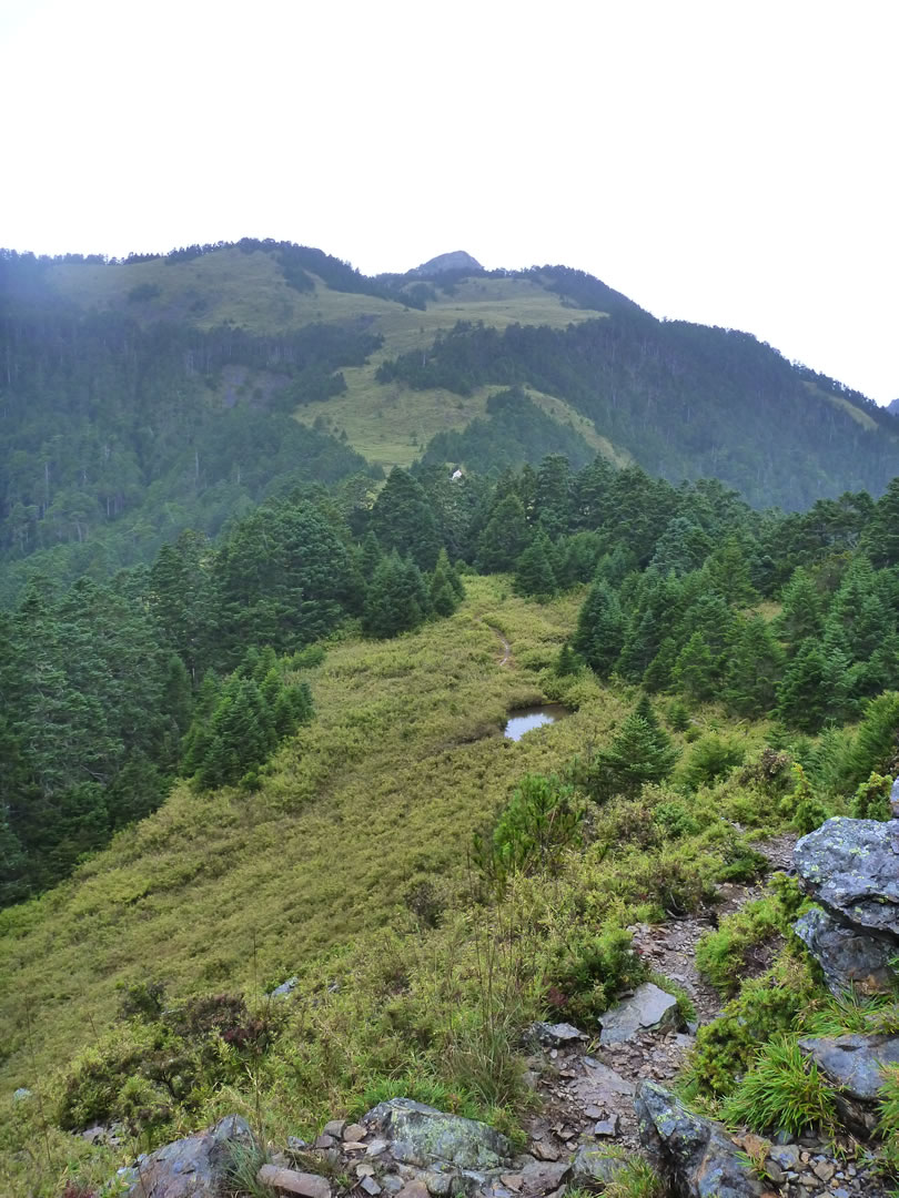 出現新達山屋,稜線上是翠綠的箭竹草原,加上水池點綴其間,令人眼界為之一開。