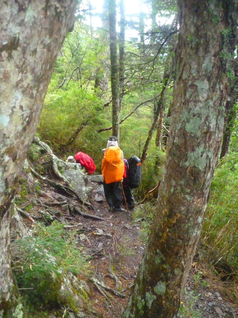 往桃山途中,下坡路段,多處需拉繩陡降,隊伍前後照應,小心慢行。