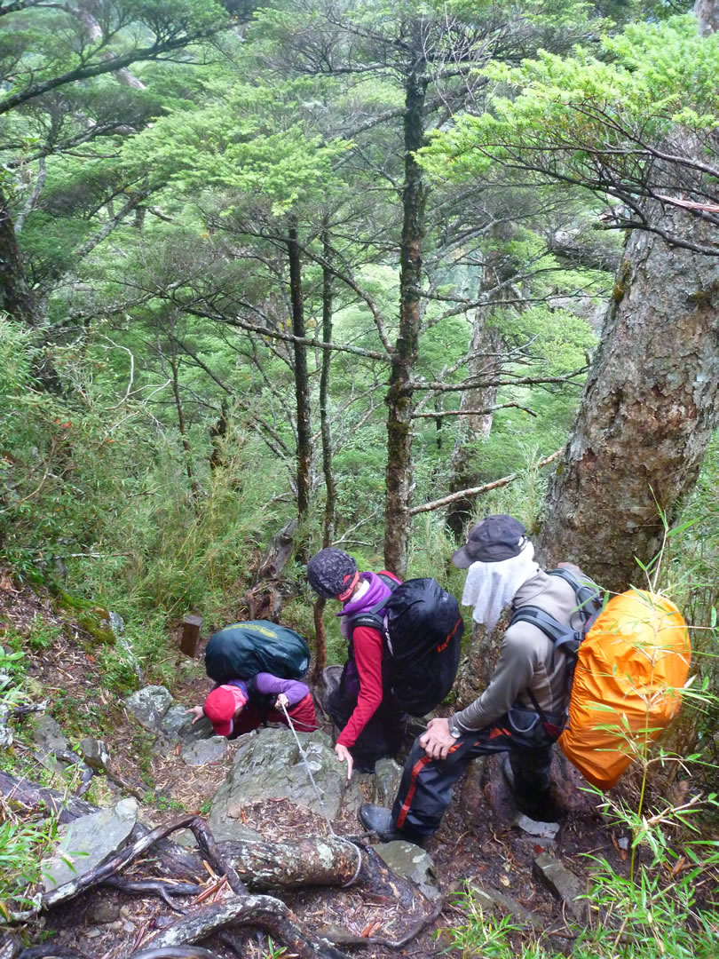 往桃山途中,下坡路段,多處需拉繩陡降,隊伍前後照應,小心慢行。