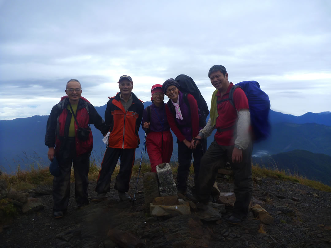 0830--0834 【桃山】(3325M,3-6327),右下武陵山莊,拍團體照後,隊伍分成兩批,有三人直接下武陵農場,其餘六人取直往喀拉業山續行。
